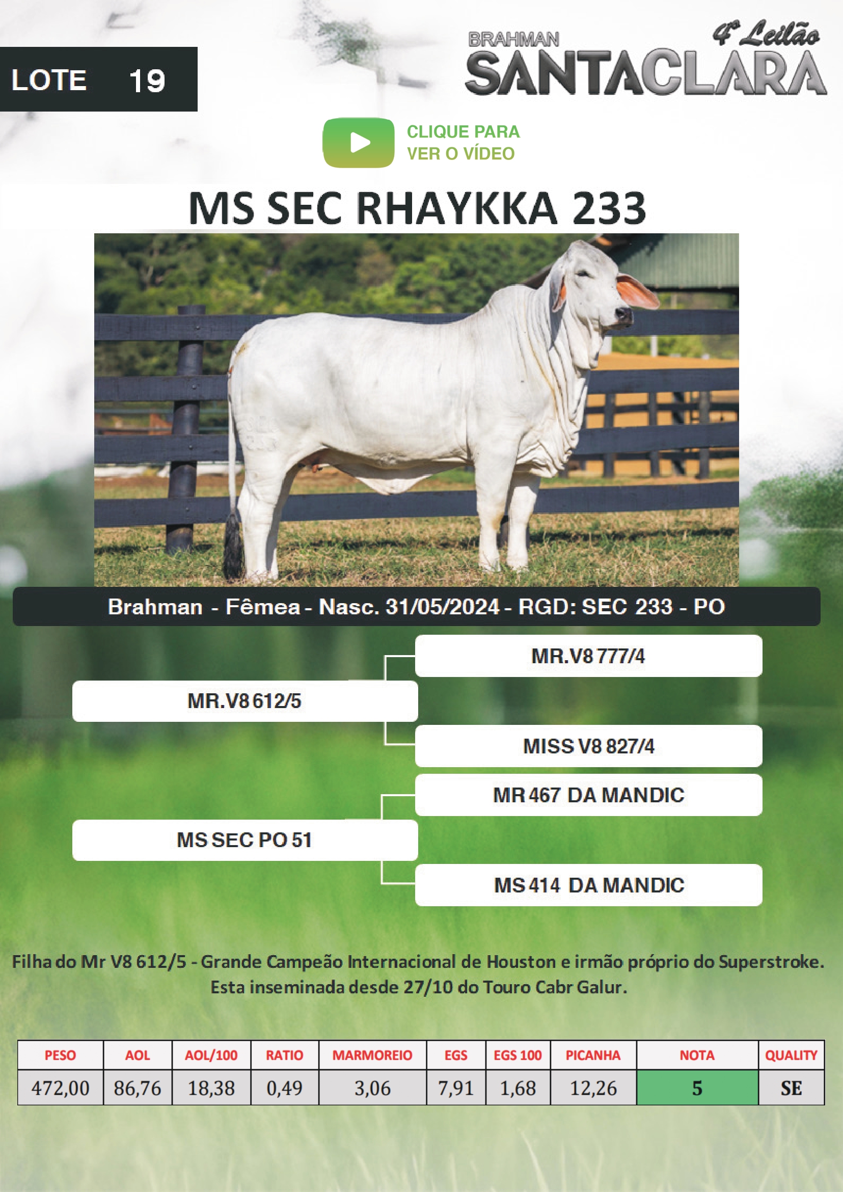 RETIRADA DO LOTE: A RETIRADA DOS ANIMAIS SERÁ APÓS A QUITAÇÃO DA COMISSÃO DE COMPRA, ENTRADA PARA O VENDEDOR E DEVOLUÇÃO DO CONTRATO DE COMPRA DEVIDAMENTE ASSINADO PELO COMPRADOR.