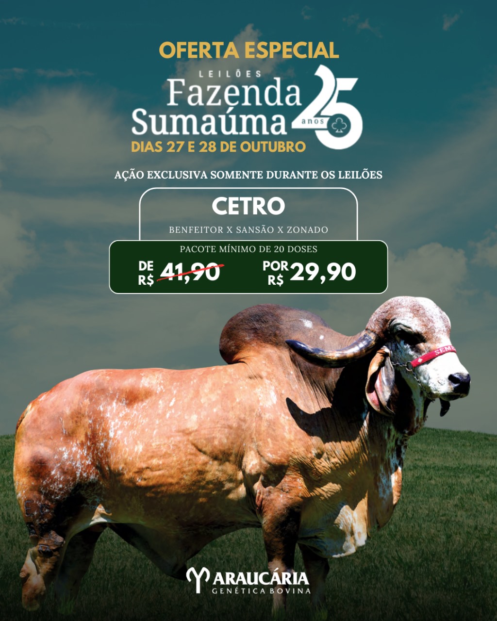 LOTE 30 - PACOTE COM 20 DOSES DE SÊMEN DO CETRO TE SILVANIA - 29,90 A DOSE